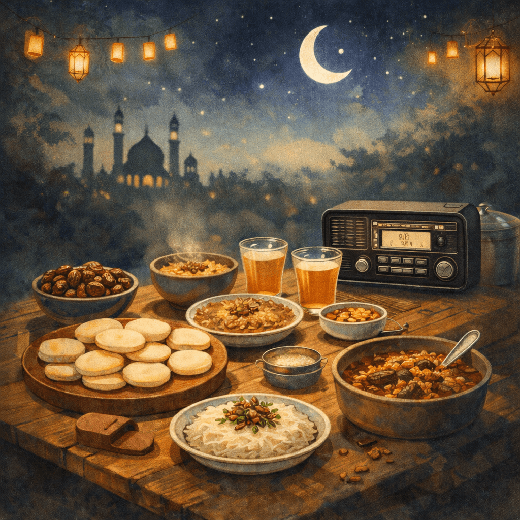 After sunset, people sit near the radio and listen attentively to know whether the new moon of Ramadan has appeared or not. Then the preparations begin. The kitchen becomes alive with the making of food for suhoor. Around two o’clock comes Umma’s wake-up call. We children jump up, rubbing our eyes, and walk to the dining table. If there are no plantains to mix with rice, we become sad. But that was very rare, as Grandma was always keen to place it on the table.